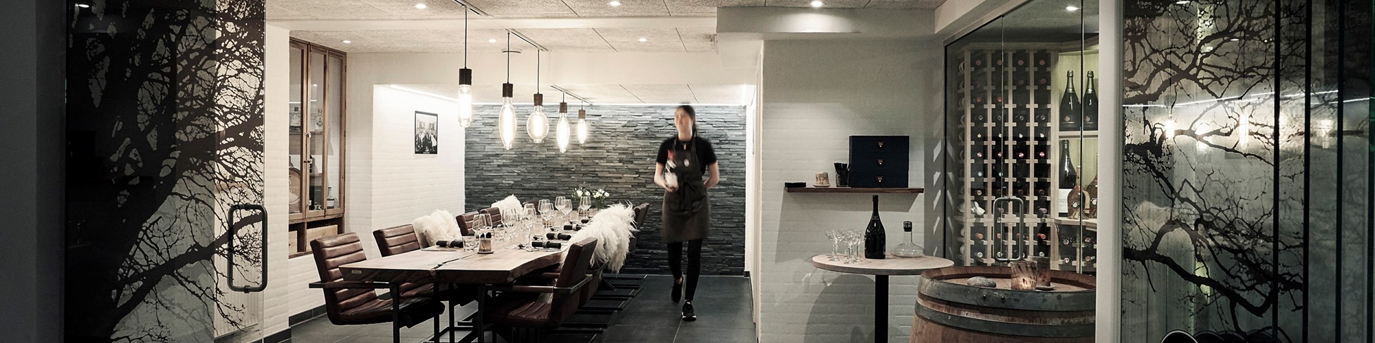 Under stuen th. ligger vores eksklusive vinkælder der bådes kan benyttes til som Chefs´s Table og til små selskaber. Ved det 5 meter lange egetræsbord er der plads til 16 personer og der er mulighed for at sidde 8 ekstra personer fordelt ved to højborde.