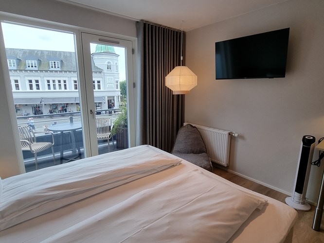 Big city atmosphere in the province. Texture is located facing Banktorvet and is modernly furnished in New York style with dark colors that are repeated in the bathroom with black marble, golden steel sink and tinted shower glass. On the balcony you will find a comfortable dining area. There is room for two people and a king size continental bed. See video