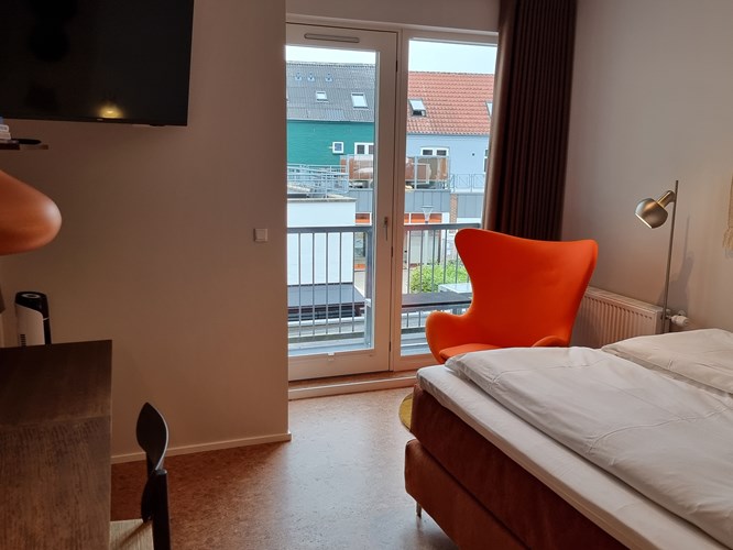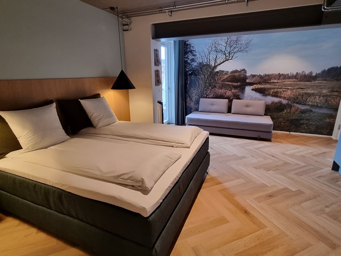 Become one with Nature, where the large wall picture of Skjern Meadows embraces the entire room. There is plenty of oak and shades of green and raw steel in the ceiling. Small balcony with bench and look at the green roofs and gable painting by Quang Ramsing. There is room for 4 people with a king-size continental bed and a flexible sofa bed. See video