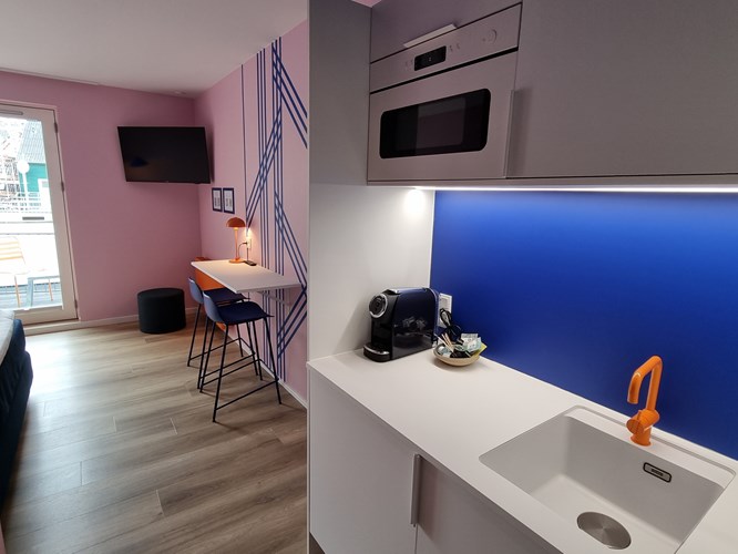 The colors are full blast in Colorful. Pink is the overall theme, which is broken by cobalt blue elements and the bright orange Vola fixture. The kitchen is box-shaped and stylish. Spacious balcony with armchairs and look to the green roofs and gable painting by Quang Ramsing. There is room for two people and a queen-size continental bed. See video