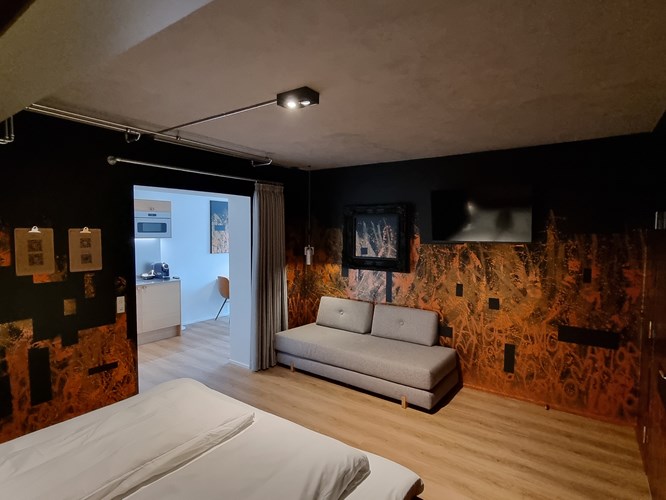 Our largest apartment is called Art. Artist Quang Ramsing has been given free rein and wrapped the bedroom in one large work of art that stands in strong contrast to oak, steel and concrete. Throw yourself in the bean bag by the French balcony and enjoy the view over the bank square. There is room for 4 people with a king-size continental bed and a flexible sofa bed. See video